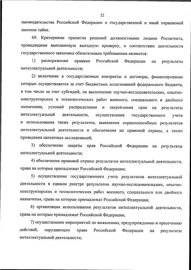 "ОБ УТВЕРЖДЕНИИ АДМИНИСТРАТИВНОГО РЕГЛАМЕНТА ОСУЩЕСТВЛЕНИЯ ФЕДЕРАЛЬНОЙ СЛУЖБОЙ ПО ИНТЕЛЛЕКТУАЛЬНОЙ СОБСТВЕННОСТИ ГОСУДАРСТВЕННОГО КОНТРОЛЯ (НАДЗОРА) В СФЕРЕ ПРАВОВОЙ ОХРАНЫ И ИСПОЛЬЗОВАНИЯ РЕЗУЛЬТАТОВ ИНТЕЛЛЕКТУАЛЬНОЙ ДЕЯТЕЛЬНОСТИ ВОЕННОГО, СПЕЦИАЛЬНОГО И ДВОЙНОГО НАЗНАЧЕНИЯ, СОЗДАННЫХ ЗА СЧЕТ БЮДЖЕТНЫХ АССИГНОВАНИЙ ФЕДЕРАЛЬНОГО БЮДЖЕТА, А ТАКЖЕ КОНТРОЛЯ (НАДЗОРА) В УСТАНОВЛЕННОЙ СФЕРЕ ДЕЯТЕЛЬНОСТИ В ОТНОШЕНИИ ГОСУДАРСТВЕННЫХ ЗАКАЗЧИКОВ И ОРГАНИЗАЦИЙ - ИСПОЛНИТЕЛЕЙ ГОСУДАРСТВЕННЫХ КОНТРАКТОВ, ПРЕДУСМАТРИВАЮЩИХ ПРОВЕДЕНИЕ НАУЧНО - ИССЛЕДОВАТЕЛЬСКИХ, ОПЫТНО - КОНСТРУКТОРСКИХ И ТЕХНОЛОГИЧЕСКИХ РАБОТ"