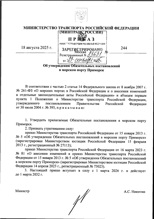 ПРИКАЗ Минтранса РФ от 18.08.2025 N 244