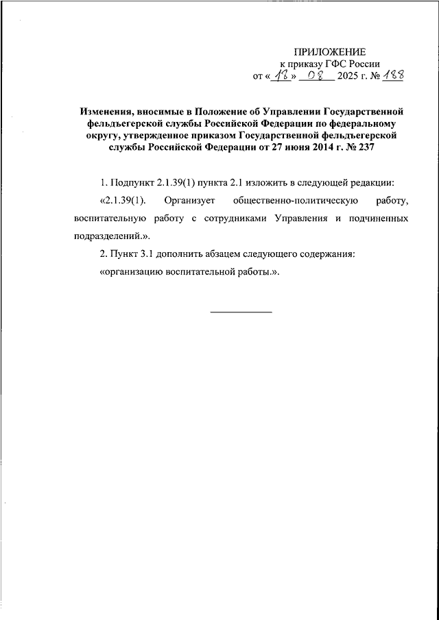 "О ВНЕСЕНИИ ИЗМЕНЕНИЙ В ПОЛОЖЕНИЕ ОБ УПРАВЛЕНИИ ГОСУДАРСТВЕННОЙ ФЕЛЬДЪЕГЕРСКОЙ СЛУЖБЫ РОССИЙСКОЙ ФЕДЕРАЦИИ ПО ФЕДЕРАЛЬНОМУ ОКРУГУ, УТВЕРЖДЕННОЕ ПРИКАЗОМ ГОСУДАРСТВЕННОЙ ФЕЛЬДЪЕГЕРСКОЙ СЛУЖБЫ РОССИЙСКОЙ ФЕДЕРАЦИИ ОТ 27 ИЮНЯ 2014 Г. N 237"