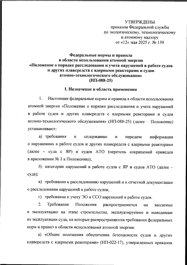 "ОБ УТВЕРЖДЕНИИ ФЕДЕРАЛЬНЫХ НОРМ И ПРАВИЛ В ОБЛАСТИ ИСПОЛЬЗОВАНИЯ АТОМНОЙ ЭНЕРГИИ "ПОЛОЖЕНИЕ О ПОРЯДКЕ РАССЛЕДОВАНИЯ И УЧЕТА НАРУШЕНИЙ В РАБОТЕ СУДОВ И ДРУГИХ ПЛАВСРЕДСТВ С ЯДЕРНЫМИ РЕАКТОРАМИ И СУДОВ АТОМНО - ТЕХНОЛОГИЧЕСКОГО ОБСЛУЖИВАНИЯ" (НП-088-25)"