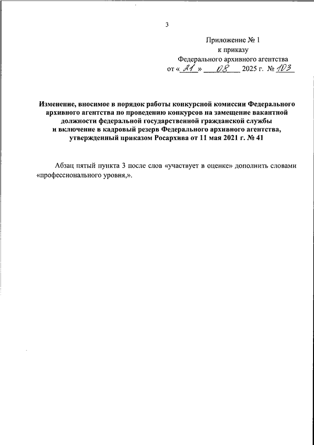 "О ВНЕСЕНИИ ИЗМЕНЕНИЙ В ПОРЯДОК РАБОТЫ КОНКУРСНОЙ КОМИССИИ ФЕДЕРАЛЬНОГО АРХИВНОГО АГЕНТСТВА ПО ПРОВЕДЕНИЮ КОНКУРСОВ НА ЗАМЕЩЕНИЕ ВАКАНТНОЙ ДОЛЖНОСТИ ФЕДЕРАЛЬНОЙ ГОСУДАРСТВЕННОЙ ГРАЖДАНСКОЙ СЛУЖБЫ И ВКЛЮЧЕНИЕ В КАДРОВЫЙ РЕЗЕРВ ФЕДЕРАЛЬНОГО АРХИВНОГО АГЕНТСТВА И МЕТОДИКУ ПРОВЕДЕНИЯ КОНКУРСА НА ЗАМЕЩЕНИЕ ВАКАНТНОЙ ДОЛЖНОСТИ ФЕДЕРАЛЬНОЙ ГОСУДАРСТВЕННОЙ ГРАЖДАНСКОЙ СЛУЖБЫ В ФЕДЕРАЛЬНОМ АРХИВНОМ АГЕНТСТВЕ, УТВЕРЖДЕННЫЕ ПРИКАЗОМ РОСАРХИВА ОТ 11 МАЯ 2021 Г. N 41"