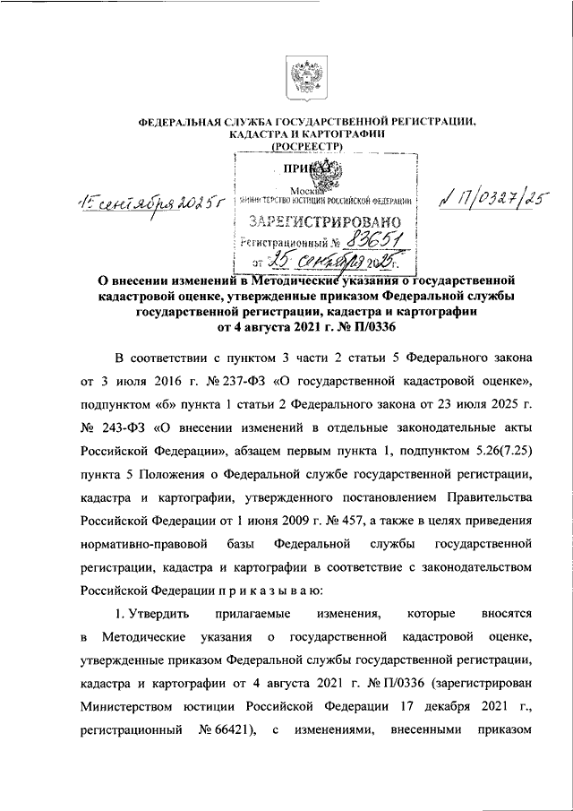 ПРИКАЗ Росреестра от 15.09.2025 N П/0327/25