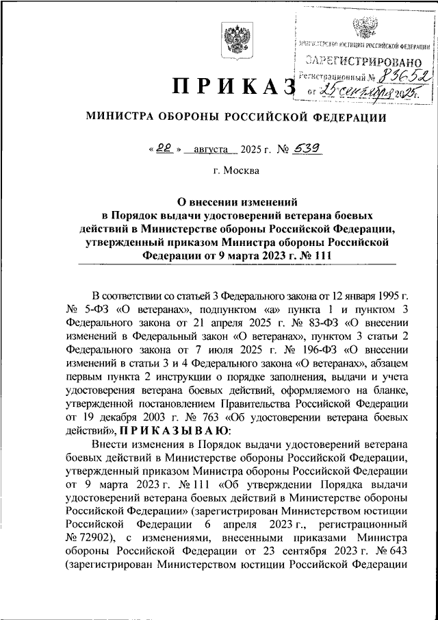 ПРИКАЗ Минобороны РФ от 22.08.2025 N 539