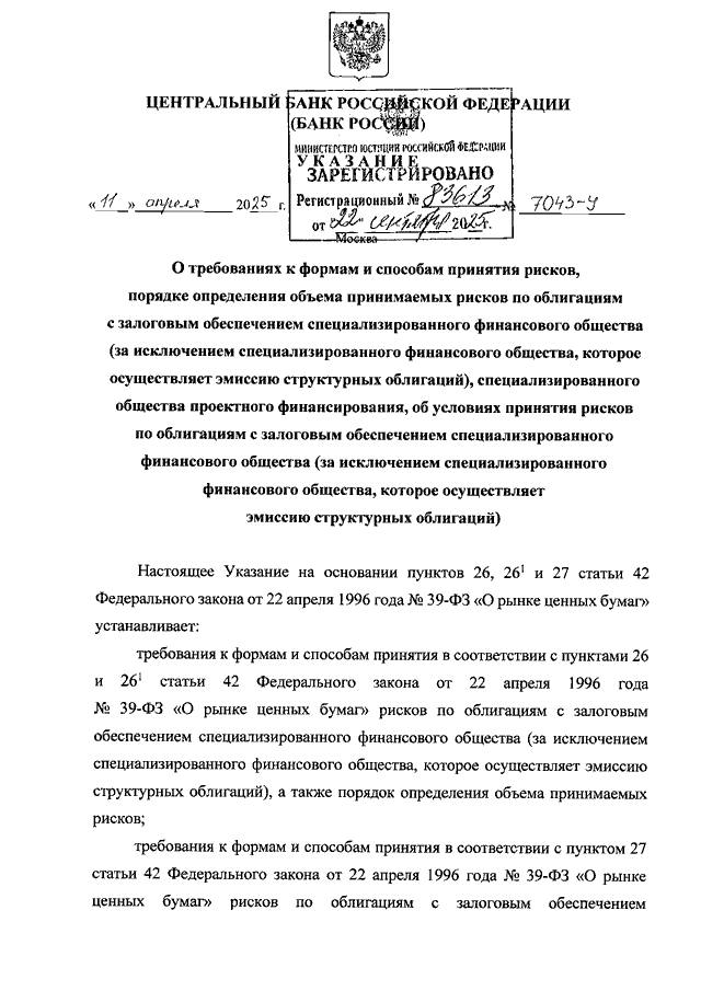 УКАЗАНИЕ ЦБ РФ от 11.04.2025 N 7043-У