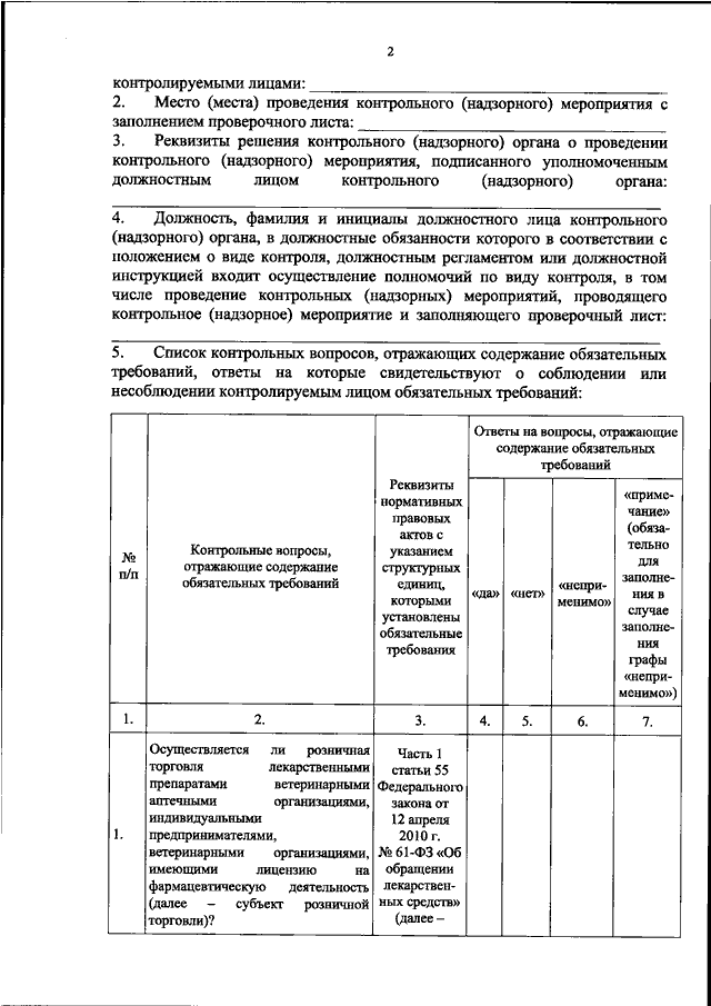 "ОБ УТВЕРЖДЕНИИ ФОРМ ПРОВЕРОЧНЫХ ЛИСТОВ (СПИСКОВ КОНТРОЛЬНЫХ ВОПРОСОВ, ОТВЕТЫ НА КОТОРЫЕ СВИДЕТЕЛЬСТВУЮТ О СОБЛЮДЕНИИ ИЛИ НЕСОБЛЮДЕНИИ КОНТРОЛИРУЕМЫМ ЛИЦОМ ОБЯЗАТЕЛЬНЫХ ТРЕБОВАНИЙ), ПРИМЕНЯЕМЫХ ФЕДЕРАЛЬНОЙ СЛУЖБОЙ ПО ВЕТЕРИНАРНОМУ И ФИТОСАНИТАРНОМУ НАДЗОРУ И ЕЕ ТЕРРИТОРИАЛЬНЫМИ ОРГАНАМИ ПРИ ОСУЩЕСТВЛЕНИИ ФЕДЕРАЛЬНОГО ГОСУДАРСТВЕННОГО КОНТРОЛЯ (НАДЗОРА) В СФЕРЕ ОБРАЩЕНИЯ ЛЕКАРСТВЕННЫХ СРЕДСТВ ДЛЯ ВЕТЕРИНАРНОГО ПРИМЕНЕНИЯ"