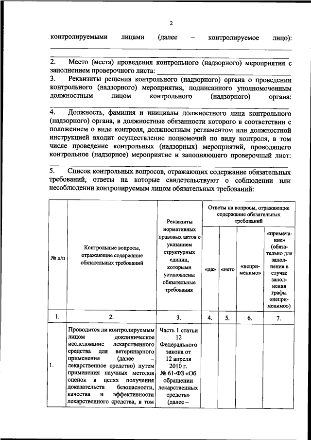 "ОБ УТВЕРЖДЕНИИ ФОРМ ПРОВЕРОЧНЫХ ЛИСТОВ (СПИСКОВ КОНТРОЛЬНЫХ ВОПРОСОВ, ОТВЕТЫ НА КОТОРЫЕ СВИДЕТЕЛЬСТВУЮТ О СОБЛЮДЕНИИ ИЛИ НЕСОБЛЮДЕНИИ КОНТРОЛИРУЕМЫМ ЛИЦОМ ОБЯЗАТЕЛЬНЫХ ТРЕБОВАНИЙ), ПРИМЕНЯЕМЫХ ФЕДЕРАЛЬНОЙ СЛУЖБОЙ ПО ВЕТЕРИНАРНОМУ И ФИТОСАНИТАРНОМУ НАДЗОРУ И ЕЕ ТЕРРИТОРИАЛЬНЫМИ ОРГАНАМИ ПРИ ОСУЩЕСТВЛЕНИИ ФЕДЕРАЛЬНОГО ГОСУДАРСТВЕННОГО КОНТРОЛЯ (НАДЗОРА) В СФЕРЕ ОБРАЩЕНИЯ ЛЕКАРСТВЕННЫХ СРЕДСТВ ДЛЯ ВЕТЕРИНАРНОГО ПРИМЕНЕНИЯ"