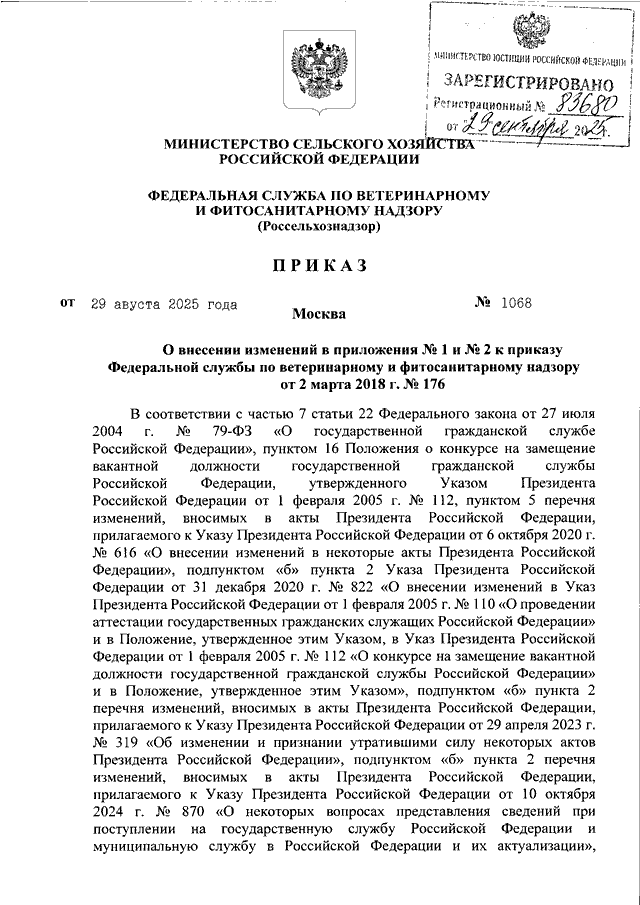 ПРИКАЗ Россельхознадзора от 29.08.2025 N 1068