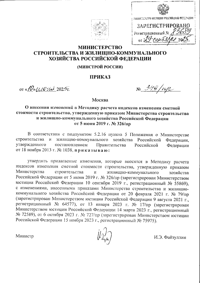 "О ВНЕСЕНИИ ИЗМЕНЕНИЙ В МЕТОДИКУ РАСЧЕТА ИНДЕКСОВ ИЗМЕНЕНИЯ СМЕТНОЙ СТОИМОСТИ СТРОИТЕЛЬСТВА, УТВЕРЖДЕННУЮ ПРИКАЗОМ МИНИСТЕРСТВА СТРОИТЕЛЬСТВА И ЖИЛИЩНО - КОММУНАЛЬНОГО ХОЗЯЙСТВА РОССИЙСКОЙ ФЕДЕРАЦИИ ОТ 5 ИЮНЯ 2019 Г. N 326/ПР"