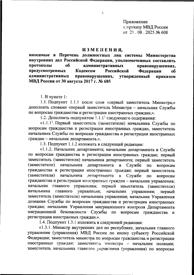 "О ВНЕСЕНИИ ИЗМЕНЕНИЙ В ПЕРЕЧЕНЬ ДОЛЖНОСТНЫХ ЛИЦ СИСТЕМЫ МИНИСТЕРСТВА ВНУТРЕННИХ ДЕЛ РОССИЙСКОЙ ФЕДЕРАЦИИ, УПОЛНОМОЧЕННЫХ СОСТАВЛЯТЬ ПРОТОКОЛЫ ОБ АДМИНИСТРАТИВНЫХ ПРАВОНАРУШЕНИЯХ, ПРЕДУСМОТРЕННЫХ КОДЕКСОМ РОССИЙСКОЙ ФЕДЕРАЦИИ ОБ АДМИНИСТРАТИВНЫХ ПРАВОНАРУШЕНИЯХ, УТВЕРЖДЕННЫЙ ПРИКАЗОМ МВД РОССИИ ОТ 30 АВГУСТА 2017 Г. N 685"