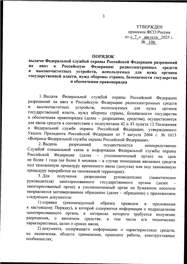 ПРИКАЗ ФСО РФ от 07.08.2025 N 106