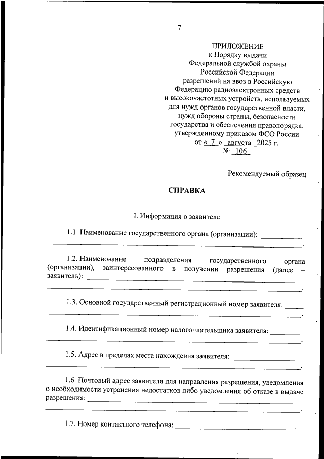 ПРИКАЗ ФСО РФ от 07.08.2025 N 106
