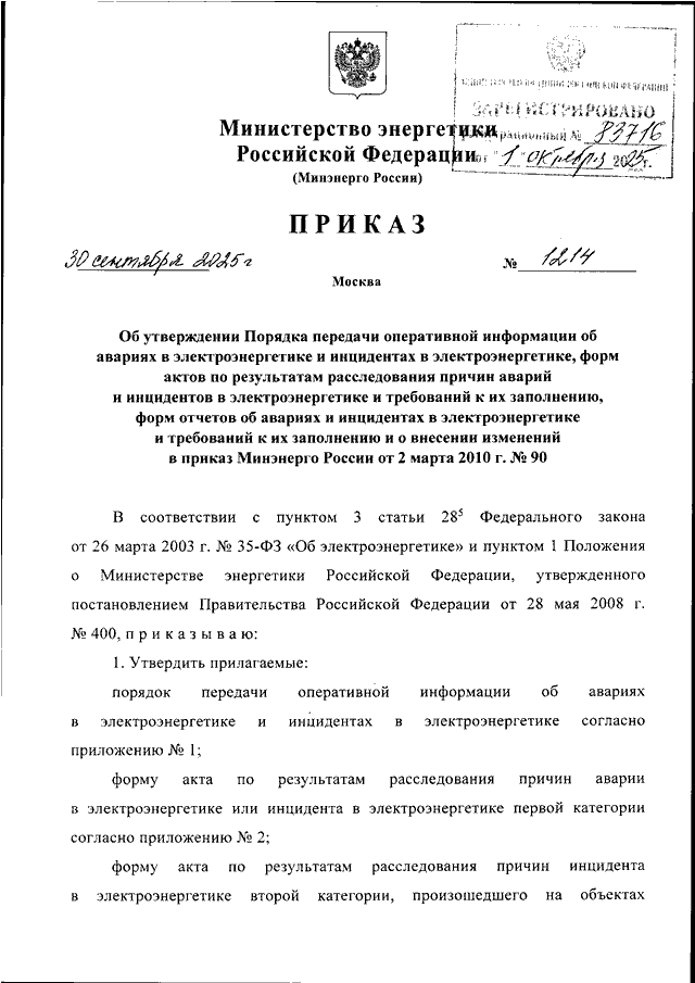 ПРИКАЗ Минэнерго РФ от 30.09.2025 N 1214