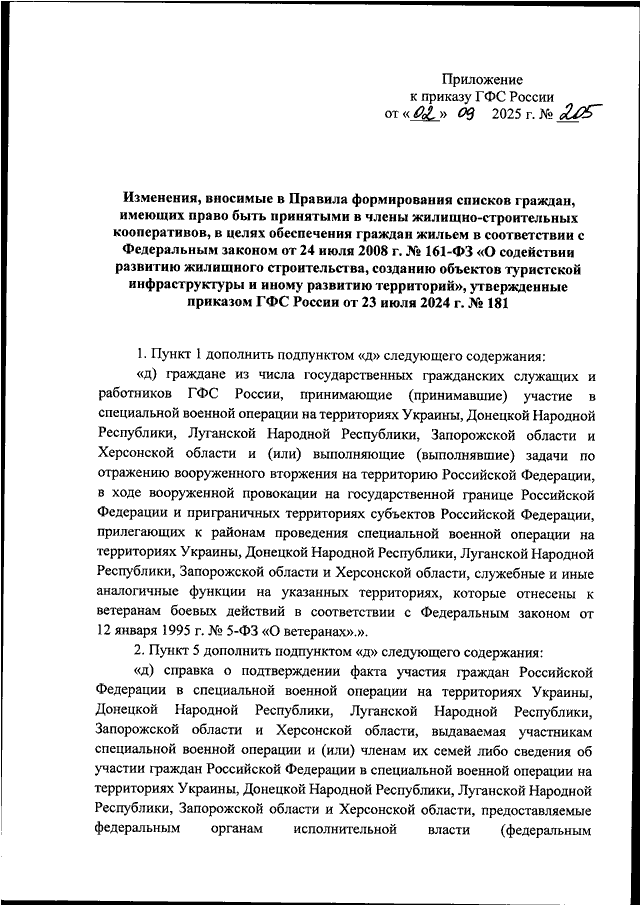 "О ВНЕСЕНИИ ИЗМЕНЕНИЙ В ПРАВИЛА ФОРМИРОВАНИЯ СПИСКОВ ГРАЖДАН, ИМЕЮЩИХ ПРАВО БЫТЬ ПРИНЯТЫМ В ЧЛЕНЫ ЖИЛИЩНО - СТРОИТЕЛЬНЫХ КООПЕРАТИВОВ, В ЦЕЛЯХ ОБЕСПЕЧЕНИЯ ГРАЖДАН ЖИЛЬЕМ В СООТВЕТСТВИИ С ФЕДЕРАЛЬНЫМ ЗАКОНОМ ОТ 24 ИЮЛЯ 2008 Г. N 161-ФЗ "О СОДЕЙСТВИИ РАЗВИТИЮ ЖИЛИЩНОГО СТРОИТЕЛЬСТВА, СОЗДАНИЮ ОБЪЕКТОВ ТУРИСТСКОЙ ИНФРАСТРУКТУРЫ И ИНОМУ РАЗВИТИЮ ТЕРРИТОРИЙ", УТВЕРЖДЕННЫЕ ПРИКАЗОМ ГОСУДАРСТВЕННОЙ ФЕЛЬДЪЕГЕРСКОЙ СЛУЖБЫ РОССИЙСКОЙ ФЕДЕРАЦИИ ОТ 23 ИЮЛЯ 2024 Г. N 181"