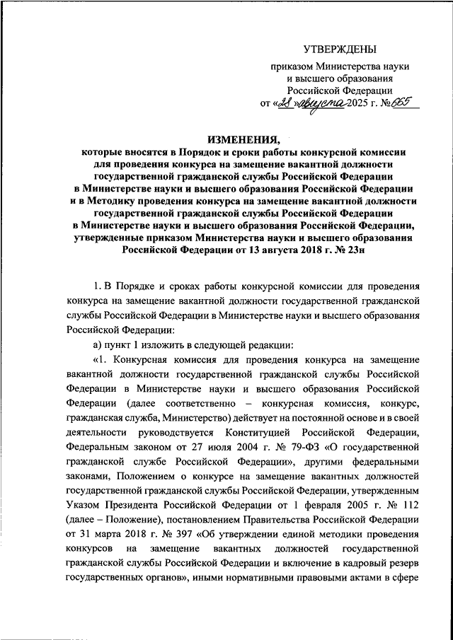 "О ВНЕСЕНИИ ИЗМЕНЕНИЙ В ПОРЯДОК И СРОКИ РАБОТЫ КОНКУРСНОЙ КОМИССИИ ДЛЯ ПРОВЕДЕНИЯ КОНКУРСА НА ЗАМЕЩЕНИЕ ВАКАНТНОЙ ДОЛЖНОСТИ ГОСУДАРСТВЕННОЙ ГРАЖДАНСКОЙ СЛУЖБЫ РОССИЙСКОЙ ФЕДЕРАЦИИ В МИНИСТЕРСТВЕ НАУКИ И ВЫСШЕГО ОБРАЗОВАНИЯ РОССИЙСКОЙ ФЕДЕРАЦИИ И В МЕТОДИКУ ПРОВЕДЕНИЯ КОНКУРСА НА ЗАМЕЩЕНИЕ ВАКАНТНОЙ ДОЛЖНОСТИ ГОСУДАРСТВЕННОЙ ГРАЖДАНСКОЙ СЛУЖБЫ РОССИЙСКОЙ ФЕДЕРАЦИИ В МИНИСТЕРСТВЕ НАУКИ И ВЫСШЕГО ОБРАЗОВАНИЯ РОССИЙСКОЙ ФЕДЕРАЦИИ, УТВЕРЖДЕННЫЕ ПРИКАЗОМ МИНИСТЕРСТВА НАУКИ И ВЫСШЕГО ОБРАЗОВАНИЯ РОССИЙСКОЙ ФЕДЕРАЦИИ ОТ 13 АВГУСТА 2018 Г. N 23Н"