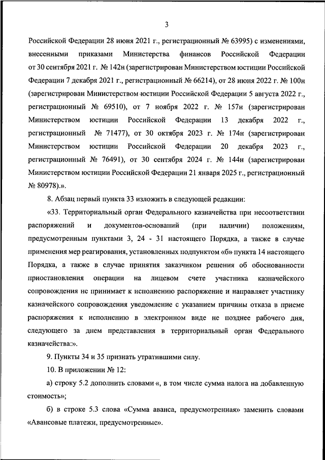 "О ВНЕСЕНИИ ИЗМЕНЕНИЙ В ПОРЯДОК ОСУЩЕСТВЛЕНИЯ ТЕРРИТОРИАЛЬНЫМИ ОРГАНАМИ ФЕДЕРАЛЬНОГО КАЗНАЧЕЙСТВА САНКЦИОНИРОВАНИЯ ОПЕРАЦИЙ СО СРЕДСТВАМИ УЧАСТНИКОВ КАЗНАЧЕЙСКОГО СОПРОВОЖДЕНИЯ, УТВЕРЖДЕННЫЙ ПРИКАЗОМ МИНИСТЕРСТВА ФИНАНСОВ РОССИЙСКОЙ ФЕДЕРАЦИИ ОТ 17 ДЕКАБРЯ 2021 Г. N 214Н"