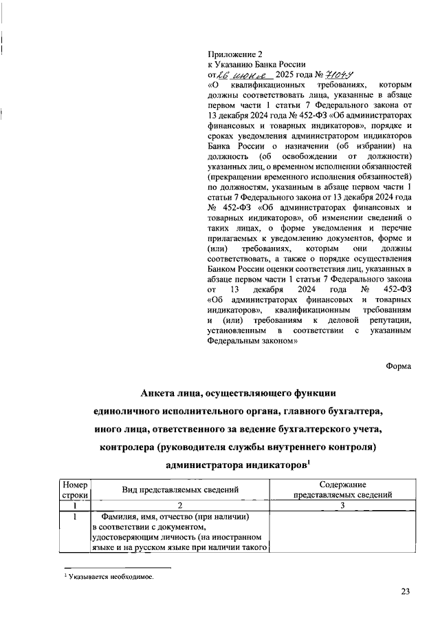 "О КВАЛИФИКАЦИОННЫХ ТРЕБОВАНИЯХ, КОТОРЫМ ДОЛЖНЫ СООТВЕТСТВОВАТЬ ЛИЦА, УКАЗАННЫЕ В АБЗАЦЕ ПЕРВОМ ЧАСТИ 1 СТАТЬИ 7 ФЕДЕРАЛЬНОГО ЗАКОНА ОТ 13 ДЕКАБРЯ 2024 Г. N 452-ФЗ "ОБ АДМИНИСТРАТОРАХ ФИНАНСОВЫХ И ТОВАРНЫХ ИНДИКАТОРОВ", ПОРЯДКЕ И СРОКАХ УВЕДОМЛЕНИЯ БАНКА РОССИИ АДМИНИСТРАТОРОМ ИНДИКАТОРОВ О НАЗНАЧЕНИИ (ОБ ИЗБРАНИИ) НА ДОЛЖНОСТЬ (ОБ ОСВОБОЖДЕНИИ ОТ ДОЛЖНОСТИ) УКАЗАННЫХ ЛИЦ, О ВРЕМЕННОМ ИСПОЛНЕНИИ ОБЯЗАННОСТЕЙ (ПРЕКРАЩЕНИИ ВРЕМЕННОГО ИСПОЛНЕНИЯ ОБЯЗАННОСТЕЙ) ПО ДОЛЖНОСТЯМ, УКАЗАННЫМ В АБЗАЦЕ ПЕРВОМ ЧАСТИ 1 СТАТЬИ 7 ФЕДЕРАЛЬНОГО ЗАКОНА ОТ 13 ДЕКАБРЯ 2024 Г. N 452-ФЗ "ОБ АДМИНИСТРАТОРАХ ФИНАНСОВЫХ И ТОВАРНЫХ ИНДИКАТОРОВ", ОБ ИЗМЕНЕНИИ СВЕДЕНИЙ О ТАКИХ ЛИЦАХ, О ФОРМЕ УВЕДОМЛЕНИЯ И ПЕРЕЧНЕ ПРИЛАГАЕМЫХ К УВЕДОМЛЕНИЮ ДОКУМЕНТОВ, ФОРМЕ И (ИЛИ) ТРЕБОВАНИЯХ, КОТОРЫМ ОНИ ДОЛЖНЫ СООТВЕТСТВОВАТЬ, А ТАКЖЕ О ПОРЯДКЕ ОСУЩЕСТВЛЕНИЯ БАНКОМ РОССИИ ОЦЕНКИ СООТВЕТСТВИЯ ЛИЦ, УКАЗАННЫХ В АБЗАЦЕ ПЕРВОМ ЧАСТИ 1 СТАТЬИ 7 ФЕДЕРАЛЬНОГО ЗАКОНА ОТ 13 ДЕКАБРЯ 2024 Г. N 452-ФЗ "ОБ АДМИНИСТРАТОРАХ ФИНАНСОВЫХ И ТОВАРНЫХ ИНДИКАТОРОВ", КВАЛИФИКАЦИОННЫМ ТРЕБОВАНИЯМ И (ИЛИ) ТРЕБОВАНИЯМ К ДЕЛОВОЙ РЕПУТАЦИИ, УСТАНОВЛЕННЫМ В СООТВЕТСТВИИ С УКАЗАННЫМ ФЕДЕРАЛЬНЫМ ЗАКОНОМ"