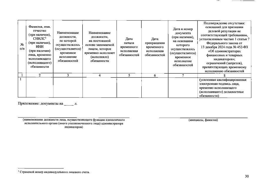 "О КВАЛИФИКАЦИОННЫХ ТРЕБОВАНИЯХ, КОТОРЫМ ДОЛЖНЫ СООТВЕТСТВОВАТЬ ЛИЦА, УКАЗАННЫЕ В АБЗАЦЕ ПЕРВОМ ЧАСТИ 1 СТАТЬИ 7 ФЕДЕРАЛЬНОГО ЗАКОНА ОТ 13 ДЕКАБРЯ 2024 Г. N 452-ФЗ "ОБ АДМИНИСТРАТОРАХ ФИНАНСОВЫХ И ТОВАРНЫХ ИНДИКАТОРОВ", ПОРЯДКЕ И СРОКАХ УВЕДОМЛЕНИЯ БАНКА РОССИИ АДМИНИСТРАТОРОМ ИНДИКАТОРОВ О НАЗНАЧЕНИИ (ОБ ИЗБРАНИИ) НА ДОЛЖНОСТЬ (ОБ ОСВОБОЖДЕНИИ ОТ ДОЛЖНОСТИ) УКАЗАННЫХ ЛИЦ, О ВРЕМЕННОМ ИСПОЛНЕНИИ ОБЯЗАННОСТЕЙ (ПРЕКРАЩЕНИИ ВРЕМЕННОГО ИСПОЛНЕНИЯ ОБЯЗАННОСТЕЙ) ПО ДОЛЖНОСТЯМ, УКАЗАННЫМ В АБЗАЦЕ ПЕРВОМ ЧАСТИ 1 СТАТЬИ 7 ФЕДЕРАЛЬНОГО ЗАКОНА ОТ 13 ДЕКАБРЯ 2024 Г. N 452-ФЗ "ОБ АДМИНИСТРАТОРАХ ФИНАНСОВЫХ И ТОВАРНЫХ ИНДИКАТОРОВ", ОБ ИЗМЕНЕНИИ СВЕДЕНИЙ О ТАКИХ ЛИЦАХ, О ФОРМЕ УВЕДОМЛЕНИЯ И ПЕРЕЧНЕ ПРИЛАГАЕМЫХ К УВЕДОМЛЕНИЮ ДОКУМЕНТОВ, ФОРМЕ И (ИЛИ) ТРЕБОВАНИЯХ, КОТОРЫМ ОНИ ДОЛЖНЫ СООТВЕТСТВОВАТЬ, А ТАКЖЕ О ПОРЯДКЕ ОСУЩЕСТВЛЕНИЯ БАНКОМ РОССИИ ОЦЕНКИ СООТВЕТСТВИЯ ЛИЦ, УКАЗАННЫХ В АБЗАЦЕ ПЕРВОМ ЧАСТИ 1 СТАТЬИ 7 ФЕДЕРАЛЬНОГО ЗАКОНА ОТ 13 ДЕКАБРЯ 2024 Г. N 452-ФЗ "ОБ АДМИНИСТРАТОРАХ ФИНАНСОВЫХ И ТОВАРНЫХ ИНДИКАТОРОВ", КВАЛИФИКАЦИОННЫМ ТРЕБОВАНИЯМ И (ИЛИ) ТРЕБОВАНИЯМ К ДЕЛОВОЙ РЕПУТАЦИИ, УСТАНОВЛЕННЫМ В СООТВЕТСТВИИ С УКАЗАННЫМ ФЕДЕРАЛЬНЫМ ЗАКОНОМ"