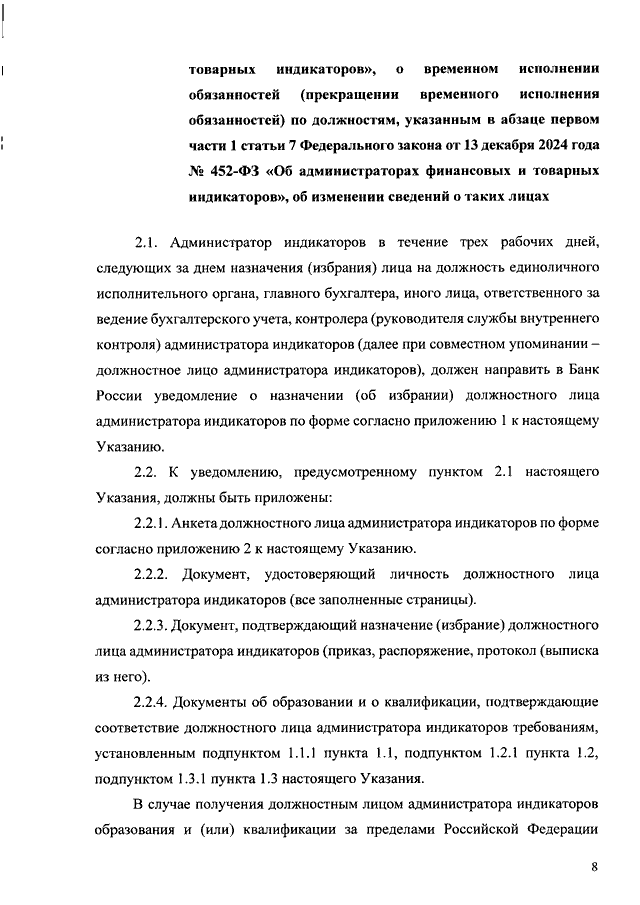 "О КВАЛИФИКАЦИОННЫХ ТРЕБОВАНИЯХ, КОТОРЫМ ДОЛЖНЫ СООТВЕТСТВОВАТЬ ЛИЦА, УКАЗАННЫЕ В АБЗАЦЕ ПЕРВОМ ЧАСТИ 1 СТАТЬИ 7 ФЕДЕРАЛЬНОГО ЗАКОНА ОТ 13 ДЕКАБРЯ 2024 Г. N 452-ФЗ "ОБ АДМИНИСТРАТОРАХ ФИНАНСОВЫХ И ТОВАРНЫХ ИНДИКАТОРОВ", ПОРЯДКЕ И СРОКАХ УВЕДОМЛЕНИЯ БАНКА РОССИИ АДМИНИСТРАТОРОМ ИНДИКАТОРОВ О НАЗНАЧЕНИИ (ОБ ИЗБРАНИИ) НА ДОЛЖНОСТЬ (ОБ ОСВОБОЖДЕНИИ ОТ ДОЛЖНОСТИ) УКАЗАННЫХ ЛИЦ, О ВРЕМЕННОМ ИСПОЛНЕНИИ ОБЯЗАННОСТЕЙ (ПРЕКРАЩЕНИИ ВРЕМЕННОГО ИСПОЛНЕНИЯ ОБЯЗАННОСТЕЙ) ПО ДОЛЖНОСТЯМ, УКАЗАННЫМ В АБЗАЦЕ ПЕРВОМ ЧАСТИ 1 СТАТЬИ 7 ФЕДЕРАЛЬНОГО ЗАКОНА ОТ 13 ДЕКАБРЯ 2024 Г. N 452-ФЗ "ОБ АДМИНИСТРАТОРАХ ФИНАНСОВЫХ И ТОВАРНЫХ ИНДИКАТОРОВ", ОБ ИЗМЕНЕНИИ СВЕДЕНИЙ О ТАКИХ ЛИЦАХ, О ФОРМЕ УВЕДОМЛЕНИЯ И ПЕРЕЧНЕ ПРИЛАГАЕМЫХ К УВЕДОМЛЕНИЮ ДОКУМЕНТОВ, ФОРМЕ И (ИЛИ) ТРЕБОВАНИЯХ, КОТОРЫМ ОНИ ДОЛЖНЫ СООТВЕТСТВОВАТЬ, А ТАКЖЕ О ПОРЯДКЕ ОСУЩЕСТВЛЕНИЯ БАНКОМ РОССИИ ОЦЕНКИ СООТВЕТСТВИЯ ЛИЦ, УКАЗАННЫХ В АБЗАЦЕ ПЕРВОМ ЧАСТИ 1 СТАТЬИ 7 ФЕДЕРАЛЬНОГО ЗАКОНА ОТ 13 ДЕКАБРЯ 2024 Г. N 452-ФЗ "ОБ АДМИНИСТРАТОРАХ ФИНАНСОВЫХ И ТОВАРНЫХ ИНДИКАТОРОВ", КВАЛИФИКАЦИОННЫМ ТРЕБОВАНИЯМ И (ИЛИ) ТРЕБОВАНИЯМ К ДЕЛОВОЙ РЕПУТАЦИИ, УСТАНОВЛЕННЫМ В СООТВЕТСТВИИ С УКАЗАННЫМ ФЕДЕРАЛЬНЫМ ЗАКОНОМ"