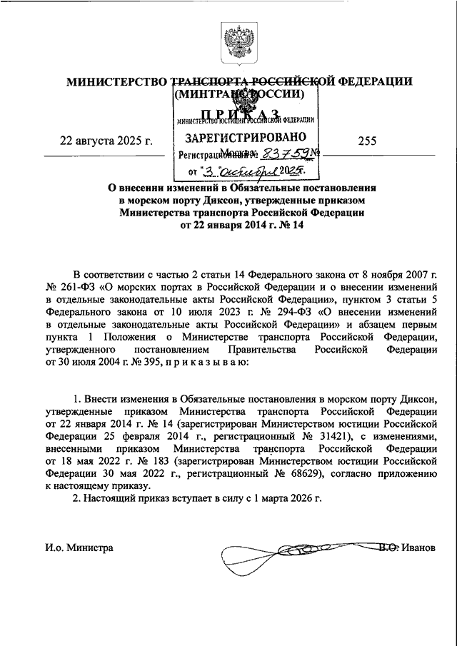 ПРИКАЗ Минтранса РФ от 22.08.2025 N 255