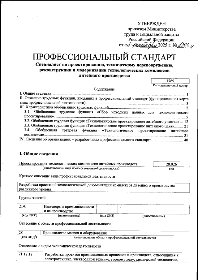 "ОБ УТВЕРЖДЕНИИ ПРОФЕССИОНАЛЬНОГО СТАНДАРТА "СПЕЦИАЛИСТ ПО ПРОЕКТИРОВАНИЮ, ТЕХНИЧЕСКОМУ ПЕРЕВООРУЖЕНИЮ, РЕКОНСТРУКЦИИ И МОДЕРНИЗАЦИИ ТЕХНОЛОГИЧЕСКИХ КОМПЛЕКСОВ ЛИТЕЙНОГО ПРОИЗВОДСТВА"