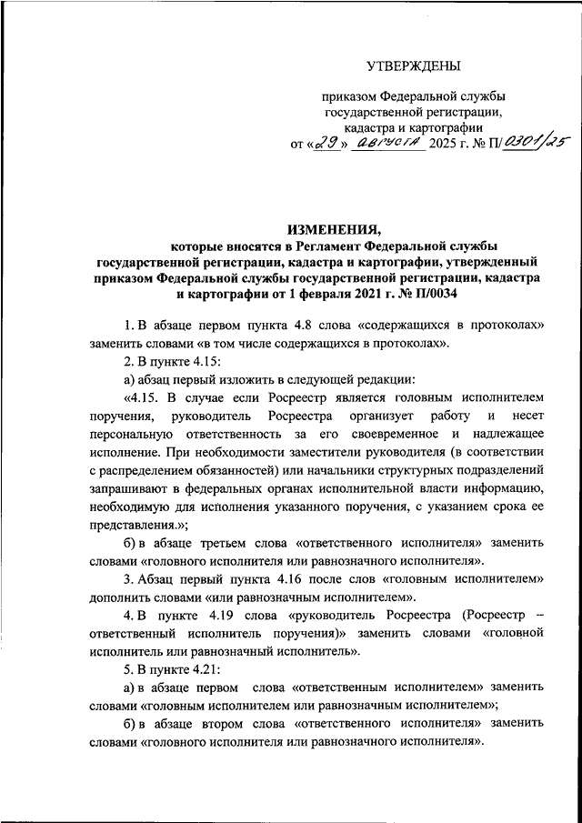 "О ВНЕСЕНИИ ИЗМЕНЕНИЙ В РЕГЛАМЕНТ ФЕДЕРАЛЬНОЙ СЛУЖБЫ ГОСУДАРСТВЕННОЙ РЕГИСТРАЦИИ, КАДАСТРА И КАРТОГРАФИИ, УТВЕРЖДЕННЫЙ ПРИКАЗОМ ФЕДЕРАЛЬНОЙ СЛУЖБЫ ГОСУДАРСТВЕННОЙ РЕГИСТРАЦИИ, КАДАСТРА И КАРТОГРАФИИ ОТ 1 ФЕВРАЛЯ 2021 Г. N П/0034"