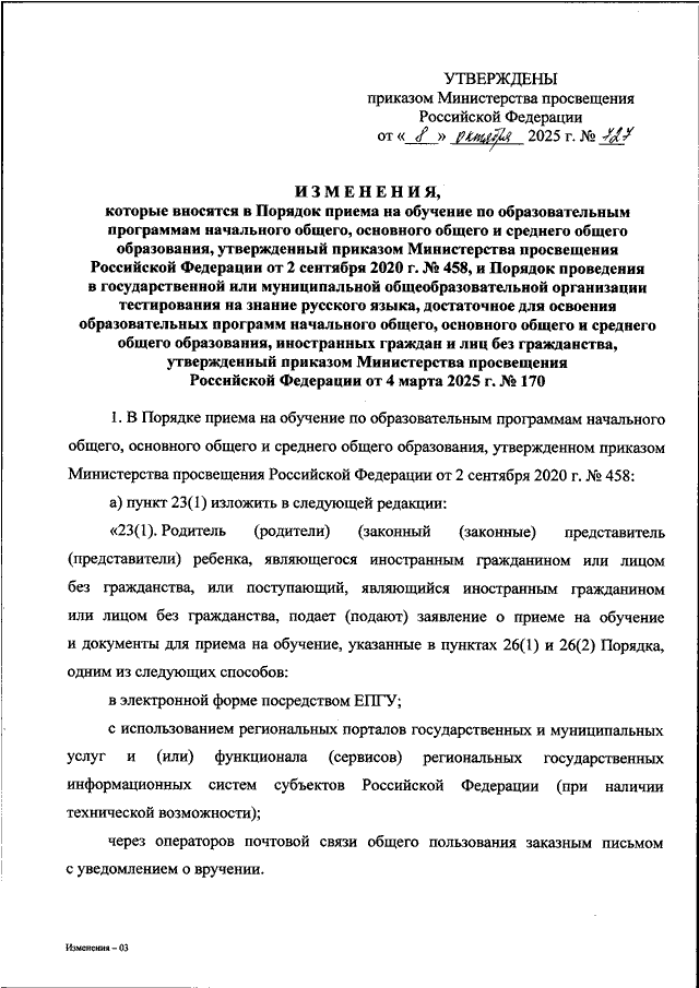 "О ВНЕСЕНИИ ИЗМЕНЕНИЙ В ПОРЯДОК ПРИЕМА НА ОБУЧЕНИЕ ПО ОБРАЗОВАТЕЛЬНЫМ ПРОГРАММАМ НАЧАЛЬНОГО ОБЩЕГО, ОСНОВНОГО ОБЩЕГО И СРЕДНЕГО ОБЩЕГО ОБРАЗОВАНИЯ, УТВЕРЖДЕННЫЙ ПРИКАЗОМ МИНИСТЕРСТВА ПРОСВЕЩЕНИЯ РОССИЙСКОЙ ФЕДЕРАЦИИ ОТ 2 СЕНТЯБРЯ 2020 Г. N 458, И ПОРЯДОК ПРОВЕДЕНИЯ В ГОСУДАРСТВЕННОЙ ИЛИ МУНИЦИПАЛЬНОЙ ОБЩЕОБРАЗОВАТЕЛЬНОЙ ОРГАНИЗАЦИИ ТЕСТИРОВАНИЯ НА ЗНАНИЕ РУССКОГО ЯЗЫКА, ДОСТАТОЧНОЕ ДЛЯ ОСВОЕНИЯ ОБРАЗОВАТЕЛЬНЫХ ПРОГРАММ НАЧАЛЬНОГО ОБЩЕГО, ОСНОВНОГО ОБЩЕГО И СРЕДНЕГО ОБЩЕГО ОБРАЗОВАНИЯ, ИНОСТРАННЫХ ГРАЖДАН И ЛИЦ БЕЗ ГРАЖДАНСТВА, УТВЕРЖДЕННЫЙ ПРИКАЗОМ МИНИСТЕРСТВА ПРОСВЕЩЕНИЯ РОССИЙСКОЙ ФЕДЕРАЦИИ ОТ 4 МАРТА 2025 Г. N 170"