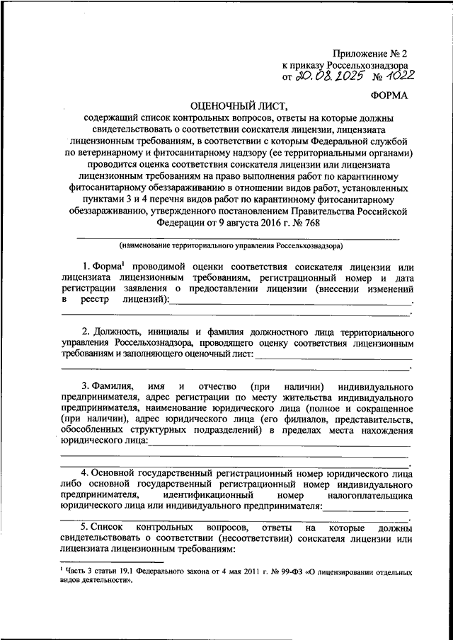 "ОБ УТВЕРЖДЕНИИ ФОРМ ОЦЕНОЧНЫХ ЛИСТОВ, СОДЕРЖАЩИХ СПИСКИ КОНТРОЛЬНЫХ ВОПРОСОВ, ОТВЕТЫ НА КОТОРЫЕ ДОЛЖНЫ СВИДЕТЕЛЬСТВОВАТЬ О СООТВЕТСТВИИ СОИСКАТЕЛЯ ЛИЦЕНЗИИ, ЛИЦЕНЗИАТА ЛИЦЕНЗИОННЫМ ТРЕБОВАНИЯМ, В СООТВЕТСТВИИ С КОТОРЫМИ ФЕДЕРАЛЬНОЙ СЛУЖБОЙ ПО ВЕТЕРИНАРНОМУ И ФИТОСАНИТАРНОМУ НАДЗОРУ (ЕЕ ТЕРРИТОРИАЛЬНЫМИ ОРГАНАМИ) ПРОВОДИТСЯ ОЦЕНКА СООТВЕТСТВИЯ СОИСКАТЕЛЯ ЛИЦЕНЗИИ ИЛИ ЛИЦЕНЗИАТА ЛИЦЕНЗИОННЫМ ТРЕБОВАНИЯМ НА ПРАВО ВЫПОЛНЕНИЯ РАБОТ ПО КАРАНТИННОМУ ФИТОСАНИТАРНОМУ ОБЕЗЗАРАЖИВАНИЮ"
