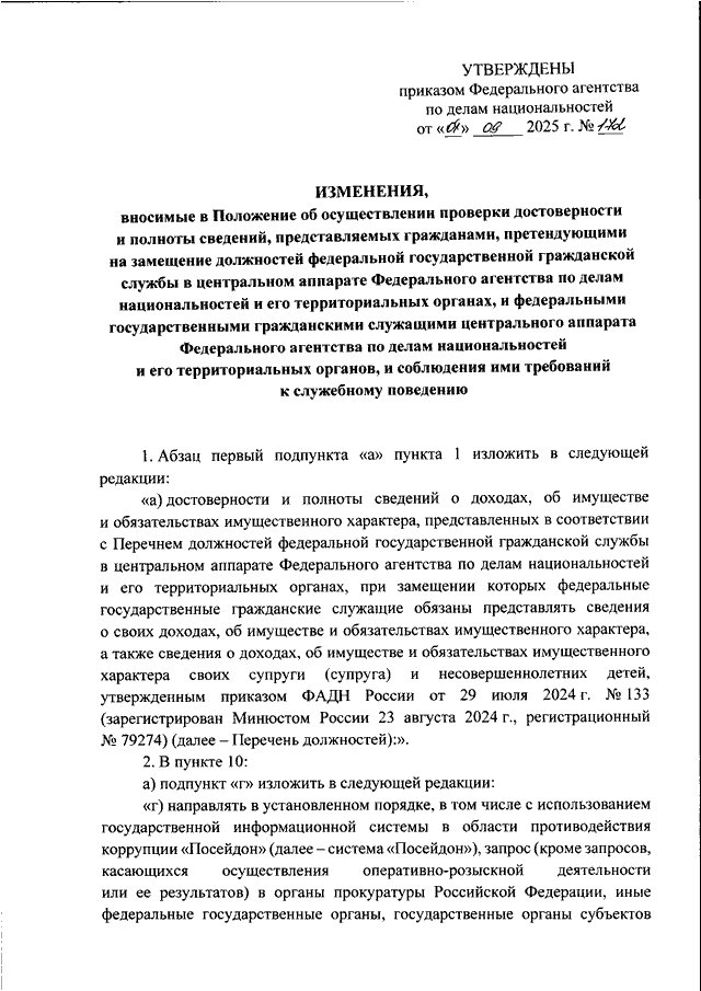 "О ВНЕСЕНИИ ИЗМЕНЕНИЙ В ПОЛОЖЕНИЕ ОБ ОСУЩЕСТВЛЕНИИ ПРОВЕРКИ ДОСТОВЕРНОСТИ И ПОЛНОТЫ СВЕДЕНИЙ, ПРЕДСТАВЛЯЕМЫХ ГРАЖДАНАМИ, ПРЕТЕНДУЮЩИМИ НА ЗАМЕЩЕНИЕ ДОЛЖНОСТЕЙ ФЕДЕРАЛЬНОЙ ГОСУДАРСТВЕННОЙ ГРАЖДАНСКОЙ СЛУЖБЫ В ЦЕНТРАЛЬНОМ АППАРАТЕ ФЕДЕРАЛЬНОГО АГЕНТСТВА ПО ДЕЛАМ НАЦИОНАЛЬНОСТЕЙ И ЕГО ТЕРРИТОРИАЛЬНЫХ ОРГАНАХ, И ФЕДЕРАЛЬНЫМИ ГОСУДАРСТВЕННЫМИ ГРАЖДАНСКИМИ СЛУЖАЩИМИ ЦЕНТРАЛЬНОГО АППАРАТА ФЕДЕРАЛЬНОГО АГЕНТСТВА ПО ДЕЛАМ НАЦИОНАЛЬНОСТЕЙ И ЕГО ТЕРРИТОРИАЛЬНЫХ ОРГАНОВ, И СОБЛЮДЕНИЯ ИМИ ТРЕБОВАНИЙ К СЛУЖЕБНОМУ ПОВЕДЕНИЮ, УТВЕРЖДЕННОЕ ПРИКАЗОМ ФЕДЕРАЛЬНОГО АГЕНТСТВА ПО ДЕЛАМ НАЦИОНАЛЬНОСТЕЙ ОТ 12 ДЕКАБРЯ 2023 Г. N 197"