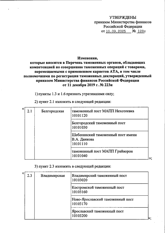 "О ВНЕСЕНИИ ИЗМЕНЕНИЙ В ПЕРЕЧЕНЬ ТАМОЖЕННЫХ ОРГАНОВ, ОБЛАДАЮЩИХ КОМПЕТЕНЦИЕЙ ПО СОВЕРШЕНИЮ ТАМОЖЕННЫХ ОПЕРАЦИЙ С ТОВАРАМИ, ПЕРЕМЕЩАЕМЫМИ С ПРИМЕНЕНИЕМ КАРНЕТОВ АТА, В ТОМ ЧИСЛЕ ПОЛНОМОЧИЯМИ ПО РЕГИСТРАЦИИ ТАМОЖЕННЫХ ДЕКЛАРАЦИЙ, УТВЕРЖДЕННЫЙ ПРИКАЗОМ МИНИСТЕРСТВА ФИНАНСОВ РОССИЙСКОЙ ФЕДЕРАЦИИ ОТ 11 ДЕКАБРЯ 2019 Г. N 223Н"