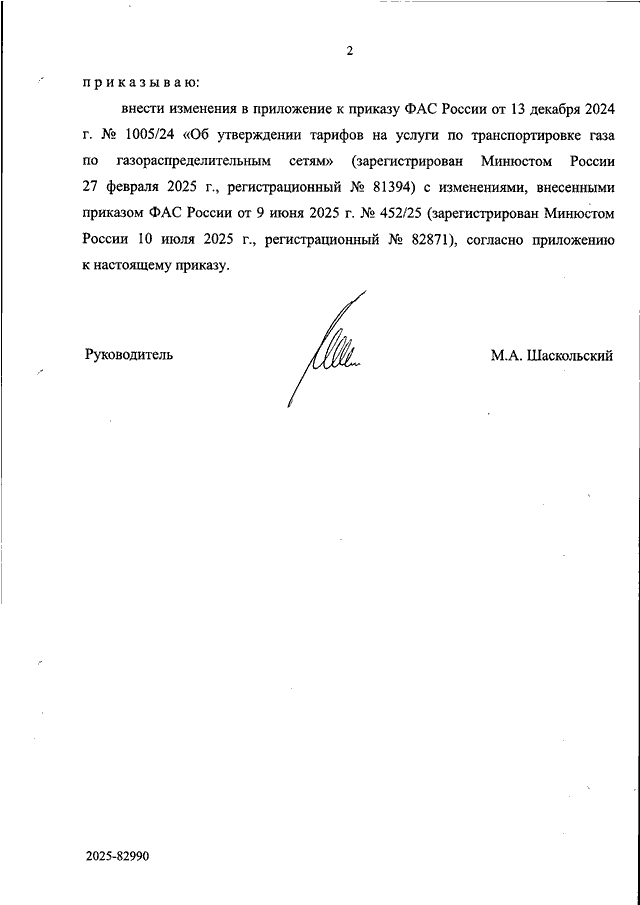 "О ВНЕСЕНИИ ИЗМЕНЕНИЙ В ПРИЛОЖЕНИЕ К ПРИКАЗУ ФАС РОССИИ ОТ 13 ДЕКАБРЯ 2024 Г. N 1005/24 "ОБ УТВЕРЖДЕНИИ ТАРИФОВ НА УСЛУГИ ПО ТРАНСПОРТИРОВКЕ ГАЗА ПО ГАЗОРАСПРЕДЕЛИТЕЛЬНЫМ СЕТЯМ"