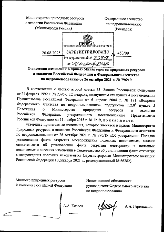 ПРИКАЗ Минприроды РФ N 453, Роснедр N 09 от 20.08.2025