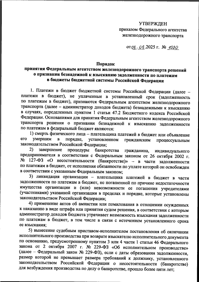 "ОБ УТВЕРЖДЕНИИ ПОРЯДКА ПРИНЯТИЯ ФЕДЕРАЛЬНЫМ АГЕНТСТВОМ ЖЕЛЕЗНОДОРОЖНОГО ТРАНСПОРТА РЕШЕНИЙ О ПРИЗНАНИИ БЕЗНАДЕЖНОЙ К ВЗЫСКАНИЮ ЗАДОЛЖЕННОСТИ ПО ПЛАТЕЖАМ В БЮДЖЕТЫ БЮДЖЕТНОЙ СИСТЕМЫ РОССИЙСКОЙ ФЕДЕРАЦИИ"