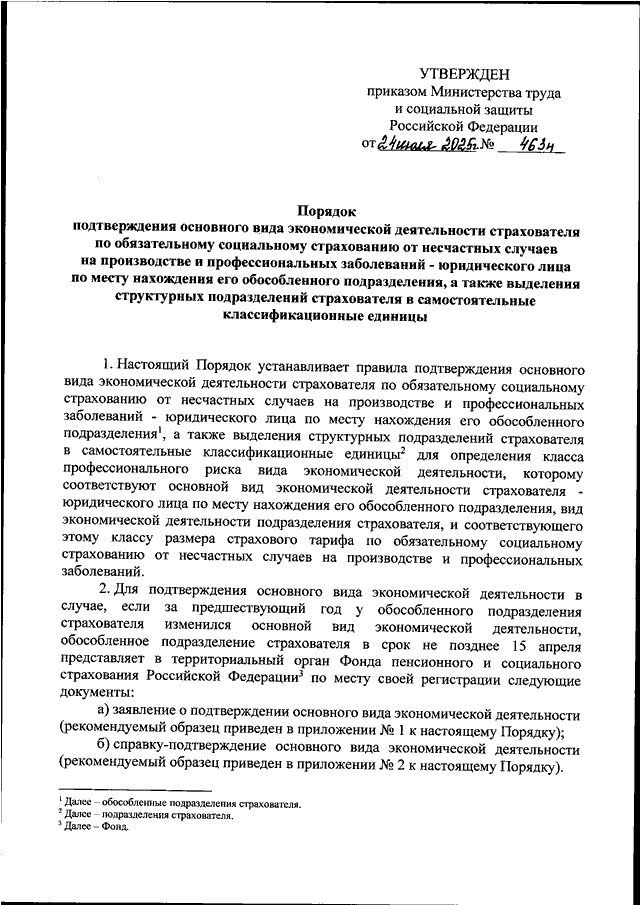 "ОБ УТВЕРЖДЕНИИ ПОРЯДКА ПОДТВЕРЖДЕНИЯ ОСНОВНОГО ВИДА ЭКОНОМИЧЕСКОЙ ДЕЯТЕЛЬНОСТИ СТРАХОВАТЕЛЯ ПО ОБЯЗАТЕЛЬНОМУ СОЦИАЛЬНОМУ СТРАХОВАНИЮ ОТ НЕСЧАСТНЫХ СЛУЧАЕВ НА ПРОИЗВОДСТВЕ И ПРОФЕССИОНАЛЬНЫХ ЗАБОЛЕВАНИЙ - ЮРИДИЧЕСКОГО ЛИЦА ПО МЕСТУ НАХОЖДЕНИЯ ЕГО ОБОСОБЛЕННОГО ПОДРАЗДЕЛЕНИЯ, А ТАКЖЕ ВЫДЕЛЕНИЯ СТРУКТУРНЫХ ПОДРАЗДЕЛЕНИЙ СТРАХОВАТЕЛЯ В САМОСТОЯТЕЛЬНЫЕ КЛАССИФИКАЦИОННЫЕ ЕДИНИЦЫ"