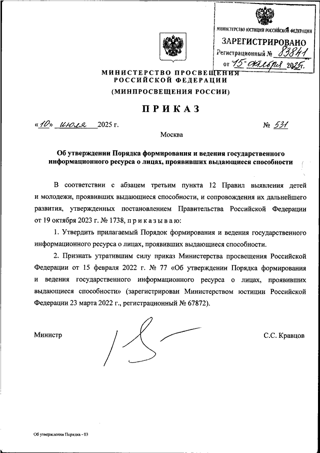 ПРИКАЗ Минпросвещения России от 10.07.2025 N 531