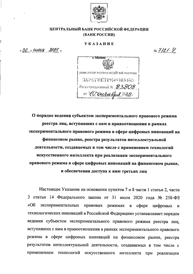 УКАЗАНИЕ ЦБ РФ от 30.06.2025 N 7121-У