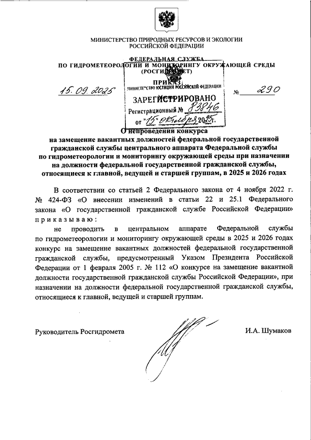ПРИКАЗ Росгидромета от 15.09.2025 N 290