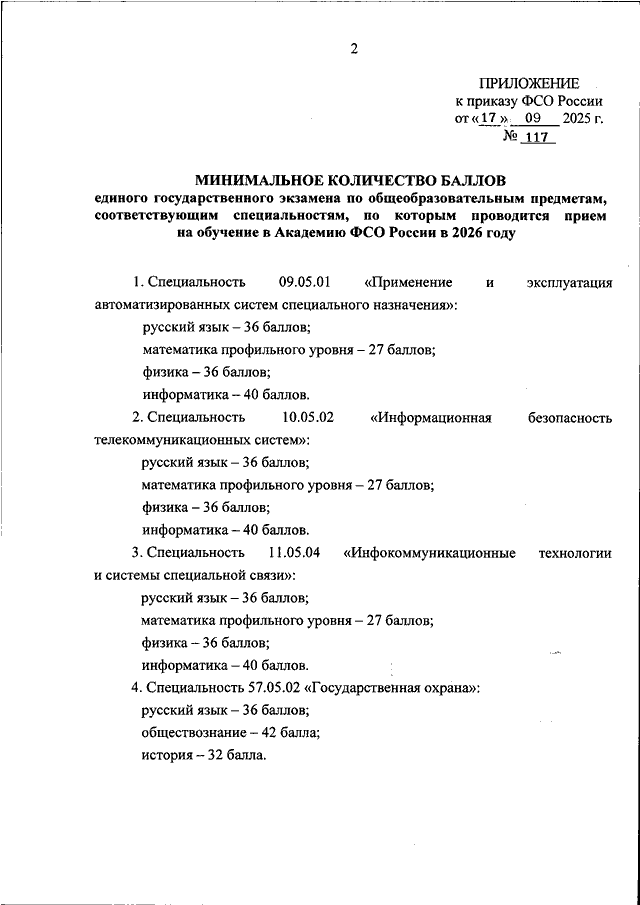 "ОБ УСТАНОВЛЕНИИ МИНИМАЛЬНОГО КОЛИЧЕСТВА БАЛЛОВ ЕДИНОГО ГОСУДАРСТВЕННОГО ЭКЗАМЕНА ПО ОБЩЕОБРАЗОВАТЕЛЬНЫМ ПРЕДМЕТАМ, СООТВЕТСТВУЮЩИМ СПЕЦИАЛЬНОСТЯМ, ПО КОТОРЫМ ПРОВОДИТСЯ ПРИЕМ НА ОБУЧЕНИЕ В АКАДЕМИЮ ФСО РОССИИ В 2026 ГОДУ"