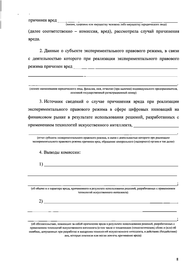 "О ПОРЯДКЕ ФОРМИРОВАНИЯ КОМИССИИ ДЛЯ УСТАНОВЛЕНИЯ ОБСТОЯТЕЛЬСТВ, ПРИ КОТОРЫХ ПРИ РЕАЛИЗАЦИИ ЭКСПЕРИМЕНТАЛЬНОГО ПРАВОВОГО РЕЖИМА В СФЕРЕ ЦИФРОВЫХ ИННОВАЦИЙ НА ФИНАНСОВОМ РЫНКЕ В РЕЗУЛЬТАТЕ ИСПОЛЬЗОВАНИЯ РЕШЕНИЙ, РАЗРАБОТАННЫХ С ПРИМЕНЕНИЕМ ТЕХНОЛОГИЙ ИСКУССТВЕННОГО ИНТЕЛЛЕКТА, ПРИЧИНЕН ВРЕД ЖИЗНИ, ЗДОРОВЬЮ ИЛИ ИМУЩЕСТВУ ЧЕЛОВЕКА ЛИБО ИМУЩЕСТВУ ЮРИДИЧЕСКОГО ЛИЦА, ПОРЯДКЕ РАССМОТРЕНИЯ КОМИССИЕЙ СЛУЧАЕВ ПРИЧИНЕНИЯ ВРЕДА ЖИЗНИ, ЗДОРОВЬЮ ИЛИ ИМУЩЕСТВУ ЧЕЛОВЕКА ЛИБО ИМУЩЕСТВУ ЮРИДИЧЕСКОГО ЛИЦА ПРИ РЕАЛИЗАЦИИ ЭКСПЕРИМЕНТАЛЬНОГО ПРАВОВОГО РЕЖИМА В СФЕРЕ ЦИФРОВЫХ ИННОВАЦИЙ НА ФИНАНСОВОМ РЫНКЕ В РЕЗУЛЬТАТЕ ИСПОЛЬЗОВАНИЯ РЕШЕНИЙ, РАЗРАБОТАННЫХ С ПРИМЕНЕНИЕМ ТЕХНОЛОГИЙ ИСКУССТВЕННОГО ИНТЕЛЛЕКТА, ПОРЯДКЕ ПОДГОТОВКИ И ФОРМЕ ЗАКЛЮЧЕНИЯ КОМИССИИ"