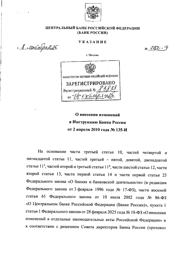"О ВНЕСЕНИИ ИЗМЕНЕНИЙ В ИНСТРУКЦИЮ БАНКА РОССИИ ОТ 2 АПРЕЛЯ 2010 Г. N 135-И"