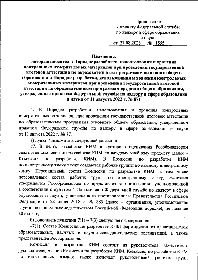 "О ВНЕСЕНИИ ИЗМЕНЕНИЙ В ПОРЯДОК РАЗРАБОТКИ, ИСПОЛЬЗОВАНИЯ И ХРАНЕНИЯ КОНТРОЛЬНЫХ ИЗМЕРИТЕЛЬНЫХ МАТЕРИАЛОВ ПРИ ПРОВЕДЕНИИ ГОСУДАРСТВЕННОЙ ИТОГОВОЙ АТТЕСТАЦИИ ПО ОБРАЗОВАТЕЛЬНЫМ ПРОГРАММАМ ОСНОВНОГО ОБЩЕГО ОБРАЗОВАНИЯ И ПОРЯДОК РАЗРАБОТКИ, ИСПОЛЬЗОВАНИЯ И ХРАНЕНИЯ КОНТРОЛЬНЫХ ИЗМЕРИТЕЛЬНЫХ МАТЕРИАЛОВ ТРИ ПРОВЕДЕНИИ ГОСУДАРСТВЕННОЙ ИТОГОВОЙ АТТЕСТАЦИИ ПО ОБРАЗОВАТЕЛЬНЫЕ ПРОГРАММАМ СРЕДНЕГО ОБЩЕГО ОБРАЗОВАНИЯ, УТВЕРЖДЕННЫЕ ПРИКАЗОМ ФЕДЕРАЛЬНОЙ СЛУЖБЫ ПО НАДЗОРУ В СФЕРЕ ОБРАЗОВАНИЯ И НАУКИ ОТ 11 АВГУСТА 2022 Г. N 871"