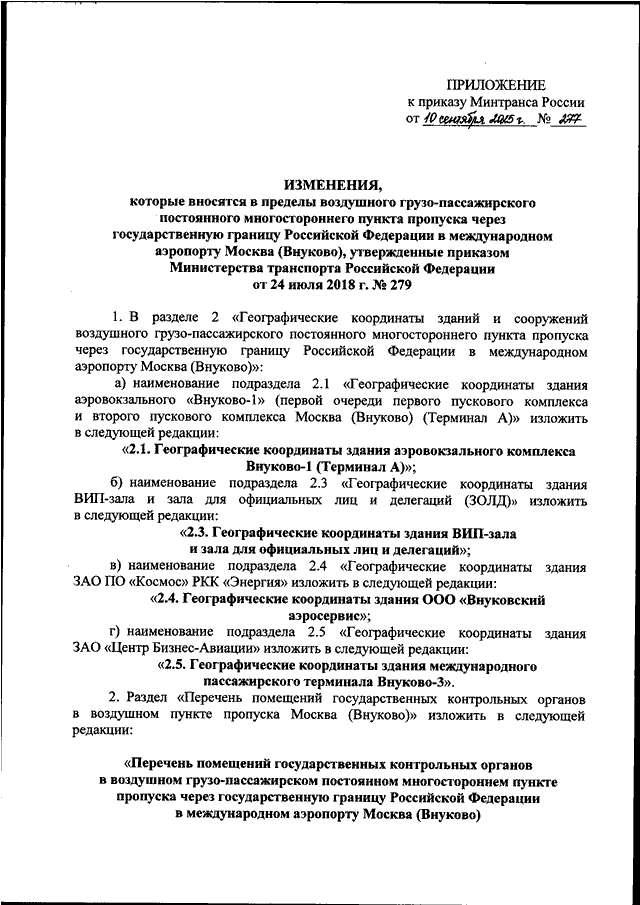 "ОБ ОТКРЫТИИ ВОЗДУШНОГО ГРУЗО - ПАССАЖИРСКОГО ПОСТОЯННОГО МНОГОСТОРОННЕГО ПУНКТА ПРОПУСКА ЧЕРЕЗ ГОСУДАРСТВЕННУЮ ГРАНИЦУ РОССИЙСКОЙ ФЕДЕРАЦИИ В МЕЖДУНАРОДНОМ АЭРОПОРТУ МОСКВА (ВНУКОВО), РЕКОНСТРУИРОВАННОГО В ПРЕДЕЛАХ АЭРОВОКЗАЛЬНОГО КОМПЛЕКСА ВНУКОВО-1 (ТЕРМИНАЛА А), И О ВНЕСЕНИИ ИЗМЕНЕНИЙ В ПРЕДЕЛЫ ВОЗДУШНОГО ГРУЗО - ПАССАЖИРСКОГО ПОСТОЯННОГО МНОГОСТОРОННЕГО ПУНКТА ПРОПУСКА ЧЕРЕЗ ГОСУДАРСТВЕННУЮ ГРАНИЦУ РОССИЙСКОЙ ФЕДЕРАЦИИ В МЕЖДУНАРОДНОМ АЭРОПОРТУ МОСКВА (ВНУКОВО), УТВЕРЖДЕННЫЕ ПРИКАЗОМ МИНИСТЕРСТВА ТРАНСПОРТА РОССИЙСКОЙ ФЕДЕРАЦИИ ОТ 24 ИЮЛЯ 2018 Г. N 279"