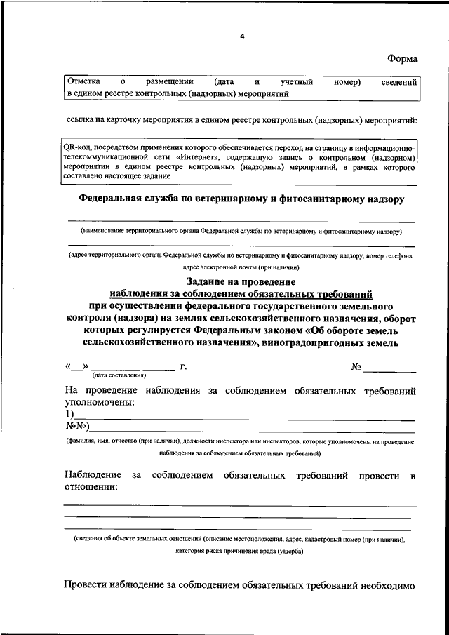 "О ВНЕСЕНИИ ИЗМЕНЕНИЙ В ПРИКАЗ РОССЕЛЬХОЗНАДЗОРА ОТ 5 ФЕВРАЛЯ 2024 Г. N 132 "ОБ УТВЕРЖДЕНИИ ФОРМ ДОКУМЕНТОВ, ИСПОЛЬЗУЕМЫХ ПРИ ОСУЩЕСТВЛЕНИИ ФЕДЕРАЛЬНОЙ СЛУЖБОЙ ПО ВЕТЕРИНАРНОМУ И ФИТОСАНИТАРНОМУ НАДЗОРУ И ЕЕ ТЕРРИТОРИАЛЬНЫМИ ОРГАНАМИ ФЕДЕРАЛЬНОГО ГОСУДАРСТВЕННОГО ЗЕМЕЛЬНОГО КОНТРОЛЯ (НАДЗОРА) НА ЗЕМЛЯХ СЕЛЬСКОХОЗЯЙСТВЕННОГО НАЗНАЧЕНИЯ, ОБОРОТ КОТОРЫХ РЕГУЛИРУЕТСЯ ФЕДЕРАЛЬНЫМ ЗАКОНОМ "ОБ ОБОРОТЕ ЗЕМЕЛЬ СЕЛЬСКОХОЗЯЙСТВЕННОГО НАЗНАЧЕНИЯ", ВИНОГРАДОПРИГОДНЫХ ЗЕМЕЛЬ"