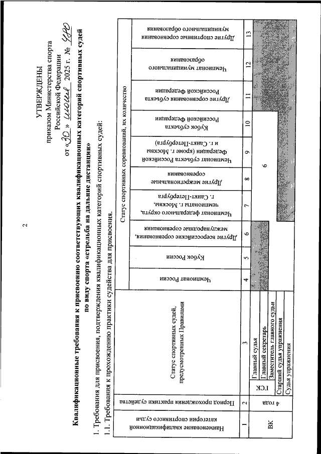 "ОБ УТВЕРЖДЕНИИ КВАЛИФИКАЦИОННЫХ ТРЕБОВАНИЙ К ПРИСВОЕНИЮ СООТВЕТСТВУЮЩИХ КВАЛИФИКАЦИОННЫХ КАТЕГОРИЙ СПОРТИВНЫХ СУДЕЙ ПО ВИДУ СПОРТА "СТРЕЛЬБА НА ДАЛЬНИЕ ДИСТАНЦИИ"