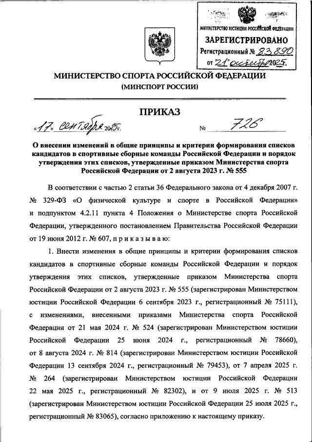 ПРИКАЗ Минспорта РФ от 17.09.2025 N 726