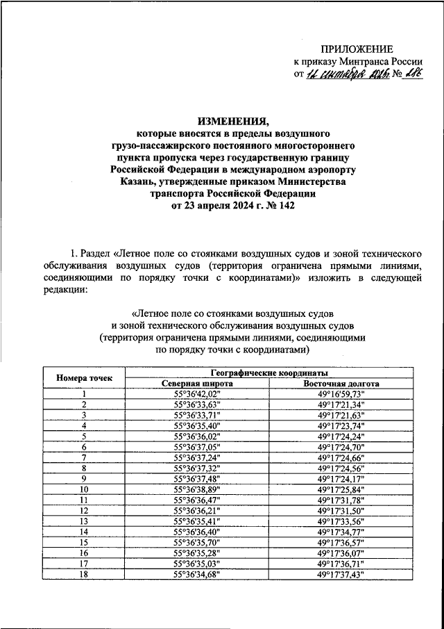 "О ВНЕСЕНИИ ИЗМЕНЕНИЙ В ПРЕДЕЛЫ ВОЗДУШНОГО ГРУЗО-ПАССАЖИРСКОГО ПОСТОЯННОГО МНОГОСТОРОННЕГО ПУНКТА ПРОПУСКА ЧЕРЕЗ ГОСУДАРСТВЕННУЮ ГРАНИЦУ РОССИЙСКОЙ ФЕДЕРАЦИИ В МЕЖДУНАРОДНОМ АЭРОПОРТУ КАЗАНЬ, УТВЕРЖДЕННЫЕ ПРИКАЗОМ МИНИСТЕРСТВА ТРАНСПОРТА РОССИЙСКОЙ ФЕДЕРАЦИИ ОТ 23 АПРЕЛЯ 2024 Г. N 142"