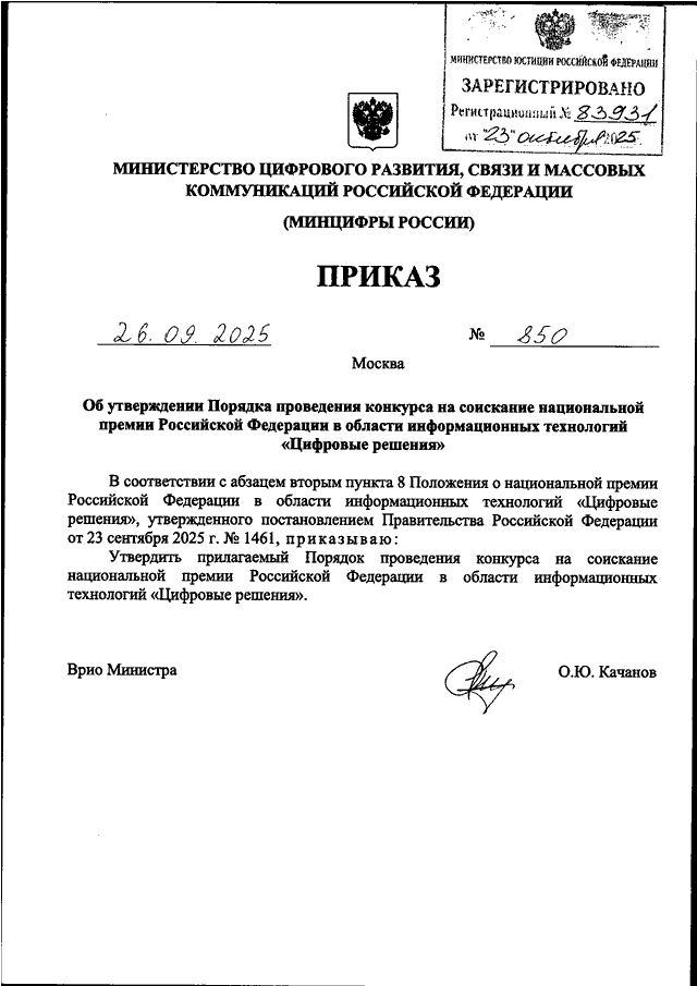 ПРИКАЗ Минцифры России от 26.09.2025 N 850