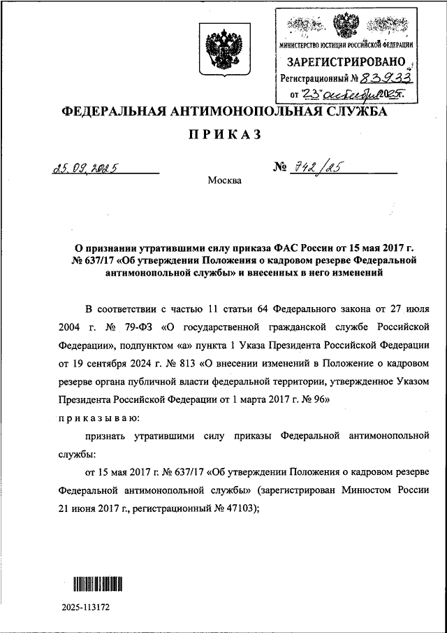 ПРИКАЗ Федеральной антимонопольной службы от 25.09.2025 N 742/25