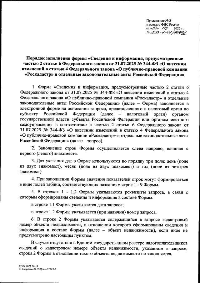 "ОБ УТВЕРЖДЕНИИ ФОРМЫ, ПОРЯДКА ЕЕ ЗАПОЛНЕНИЯ, ФОРМАТА И ПОРЯДКА ПРЕДСТАВЛЕНИЯ В ЭЛЕКТРОННОЙ ФОРМЕ СВЕДЕНИЙ И ИНФОРМАЦИИ, ПРЕДУСМОТРЕННЫХ ЧАСТЬЮ 2 СТАТЬИ 6 ФЕДЕРАЛЬНОГО ЗАКОНА ОТ 31.07.2025 N 344-ФЗ "О ВНЕСЕНИИ ИЗМЕНЕНИЙ В СТАТЬЮ 4 ФЕДЕРАЛЬНОГО ЗАКОНА "О ПУБЛИЧНО - ПРАВОВОЙ КОМПАНИИ "РОСКАДАСТР" И ОТДЕЛЬНЫЕ ЗАКОНОДАТЕЛЬНЫЕ АКТЫ РОССИЙСКОЙ ФЕДЕРАЦИИ"
