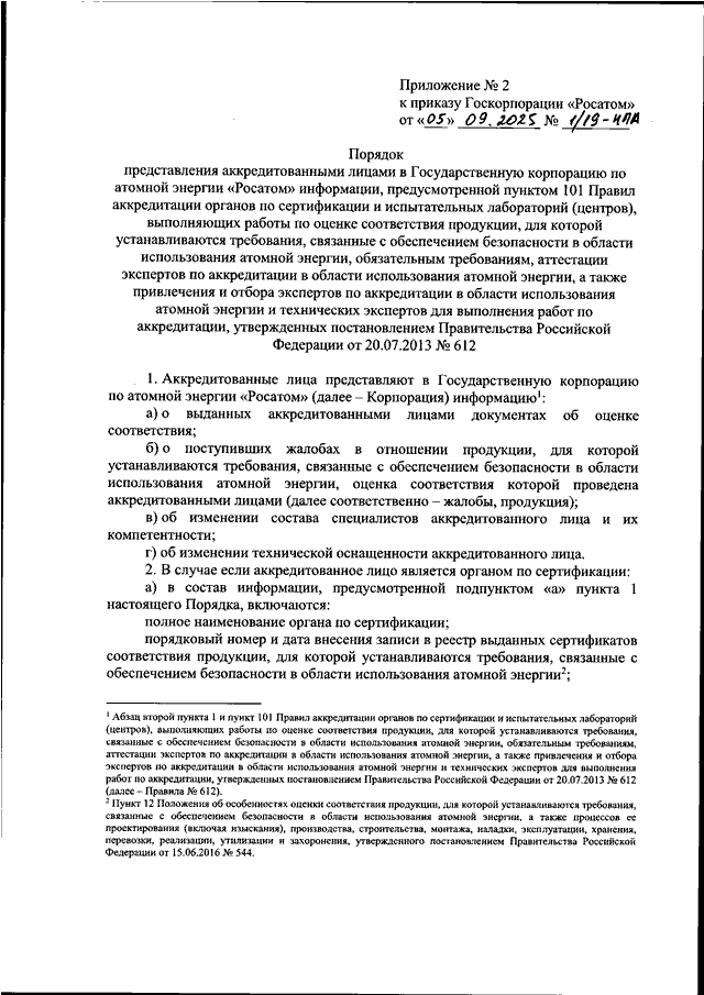 "Росатом" от 05.09.2025 N 1/19-НПА "ОБ УТВЕРЖДЕНИИ ПОРЯДКОВ, СВЯЗАННЫХ С МОНИТОРИНГОМ ГОСУДАРСТВЕННОЙ КОРПОРАЦИЕЙ ПО АТОМНОЙ ЭНЕРГИИ "РОСАТОМ" ДЕЯТЕЛЬНОСТИ АККРЕДИТОВАННЫХ ЛИЦ, ЭКСПЕРТОВ ПО АККРЕДИТАЦИИ И ТЕХНИЧЕСКИХ ЭКСПЕРТОВ ПРИ ОСУЩЕСТВЛЕНИИ АККРЕДИТАЦИИ В ОБЛАСТИ ИСПОЛЬЗОВАНИЯ АТОМНОЙ ЭНЕРГИИ"