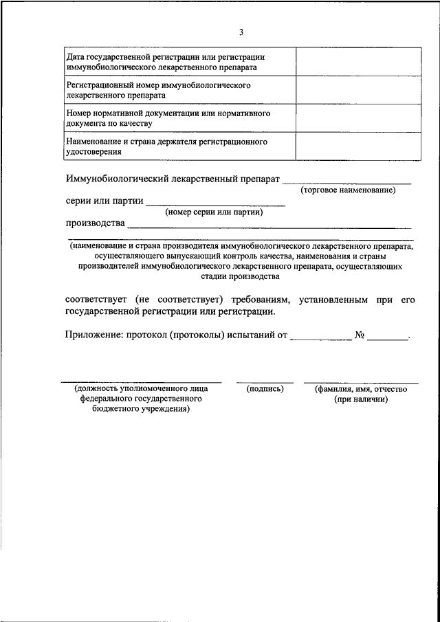 "ОБ УТВЕРЖДЕНИИ ФОРМЫ ЗАКЛЮЧЕНИЯ О СООТВЕТСТВИИ СЕРИИ ИЛИ ПАРТИИ ИММУНОБИОЛОГИЧЕСКОГО ЛЕКАРСТВЕННОГО ПРЕПАРАТА ТРЕБОВАНИЯМ, УСТАНОВЛЕННЫМ ПРИ ЕГО ГОСУДАРСТВЕННОЙ РЕГИСТРАЦИИ ИЛИ РЕГИСТРАЦИИ, ФОРМЫ ВЫПИСКИ ИЗ РЕЕСТРА РАЗРЕШЕНИЙ НА ВВОД В ГРАЖДАНСКИЙ ОБОРОТ КАЖДОЙ СЕРИИ ИЛИ КАЖДОЙ ПАРТИИ ПРОИЗВЕДЕННОГО В РОССИЙСКОЙ ФЕДЕРАЦИИ ИЛИ ВВОЗИМОГО В РОССИЙСКУЮ ФЕДЕРАЦИЮ ИММУНОБИОЛОГИЧЕСКОГО ЛЕКАРСТВЕННОГО ПРЕПАРАТА И ФОРМЫ УВЕДОМЛЕНИЯ ЗАЯВИТЕЛЯ О ПРИНЯТОМ РЕШЕНИИ ОБ ОТКАЗЕ В ВЫДАЧЕ РАЗРЕШЕНИЯ НА ВВОД В ГРАЖДАНСКИЙ ОБОРОТ КАЖДОЙ СЕРИИ ИЛИ КАЖДОЙ ПАРТИИ ПРОИЗВЕДЕННОГО В РОССИЙСКОЙ ФЕДЕРАЦИИ ИЛИ ВВОЗИМОГО В РОССИЙСКУЮ ФЕДЕРАЦИЮ ИММУНОБИОЛОГИЧЕСКОГО ЛЕКАРСТВЕННОГО ПРЕПАРАТА"